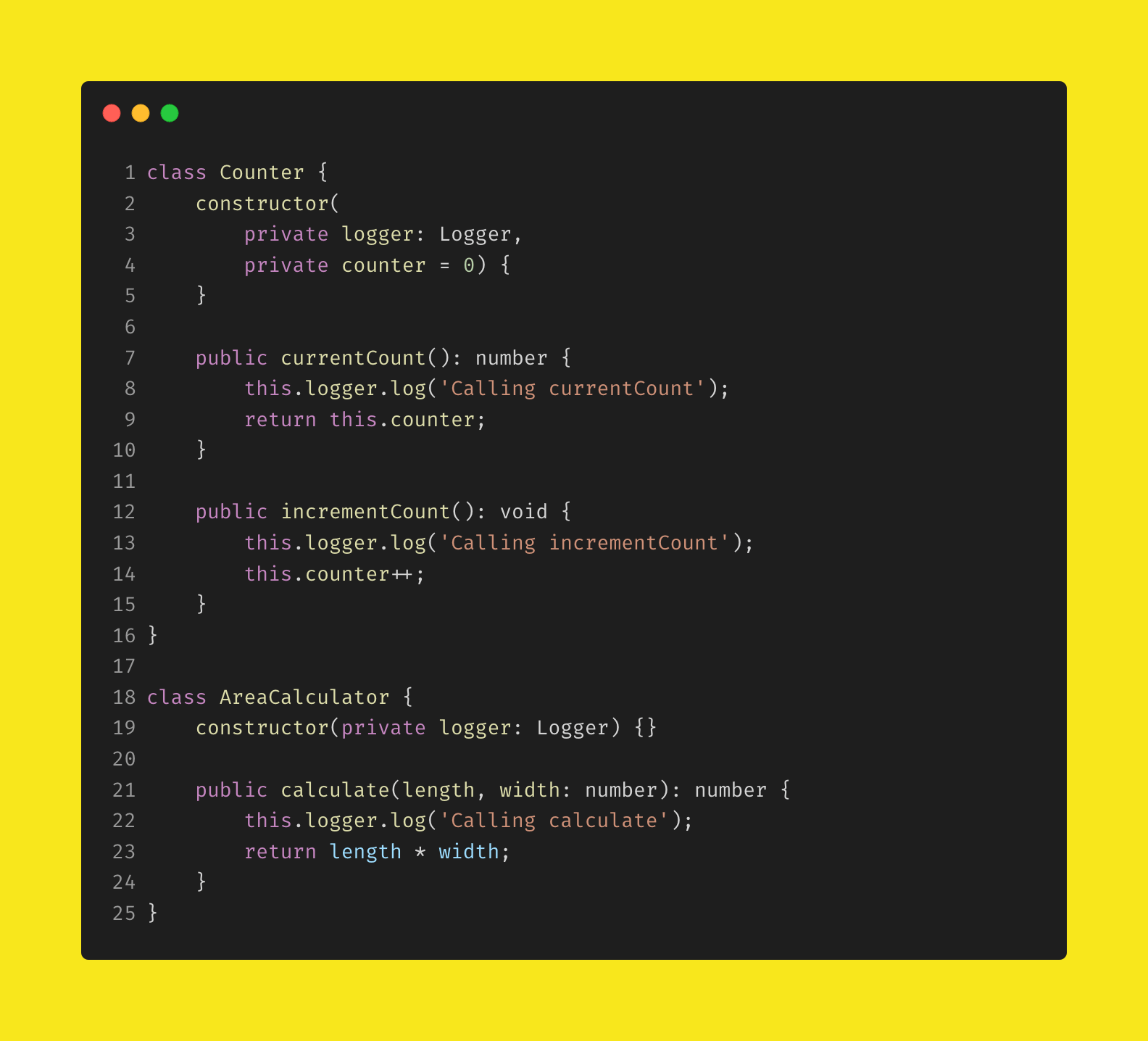 На первый взгляд, здесь нет ничего плохого. Мы внедряем реализации Logger (который, как оказалось, является интерфейсом, мы скоро увидим), так что это отметка в поле SOLID.