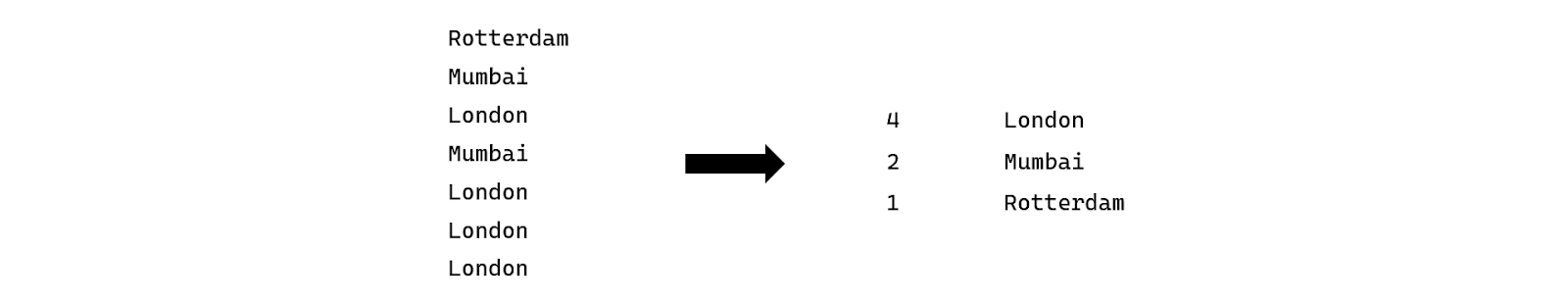Интуитивно понятно, что первым делом нужно сначала подсчитать города, а затем отсортировать их, но это не лучший способ в bash. Чтобы подсчитать количество экземпляров чего-либо в bash, лучше сначала отсортировать (отсортировать), а затем подсчитать, удалив все двойники (uniq -c). Мы можем снова объединить эти операции, используя конвейерную обработку. В результате получится следующий код: tail -7 ‘data.csv’ | вырезать -d ‘,’ -f 4 | сортировать | uniq -c