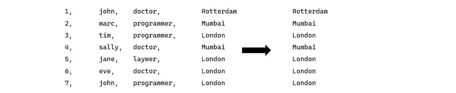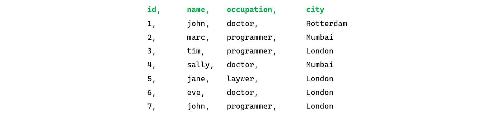 Цель науки о данных - извлекать знания из данных. Итак, чтобы показать, как bash может быть реализован в науке о данных, нам нужны фиктивные данные для работы. В этой статье мы будем использовать этот простой CSV-файл (нажмите здесь, чтобы увидеть источник) и использовать bash, чтобы выяснить, какие города наиболее часто встречаются в этом наборе данных. Имейте в виду, что в реальной жизни вы, вероятно, будете использовать гораздо большие наборы данных, чем этот.