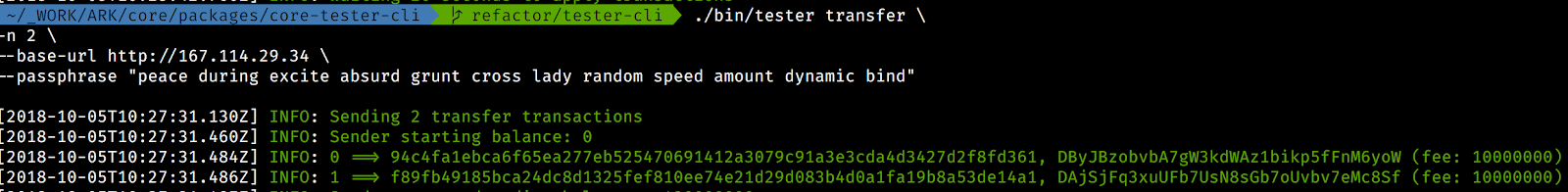 ./bin/tester transfer \ -n 2 \ --base-url http://127.0.0.1 \ --transfer-fee 5000 \ --passphrase "your 12 word passphrase"