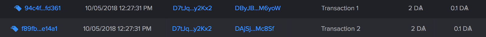 Если мы проверим транзакции в dexplorer.ark.io, мы увидим, что две транзакции были подтверждены и подделаны: