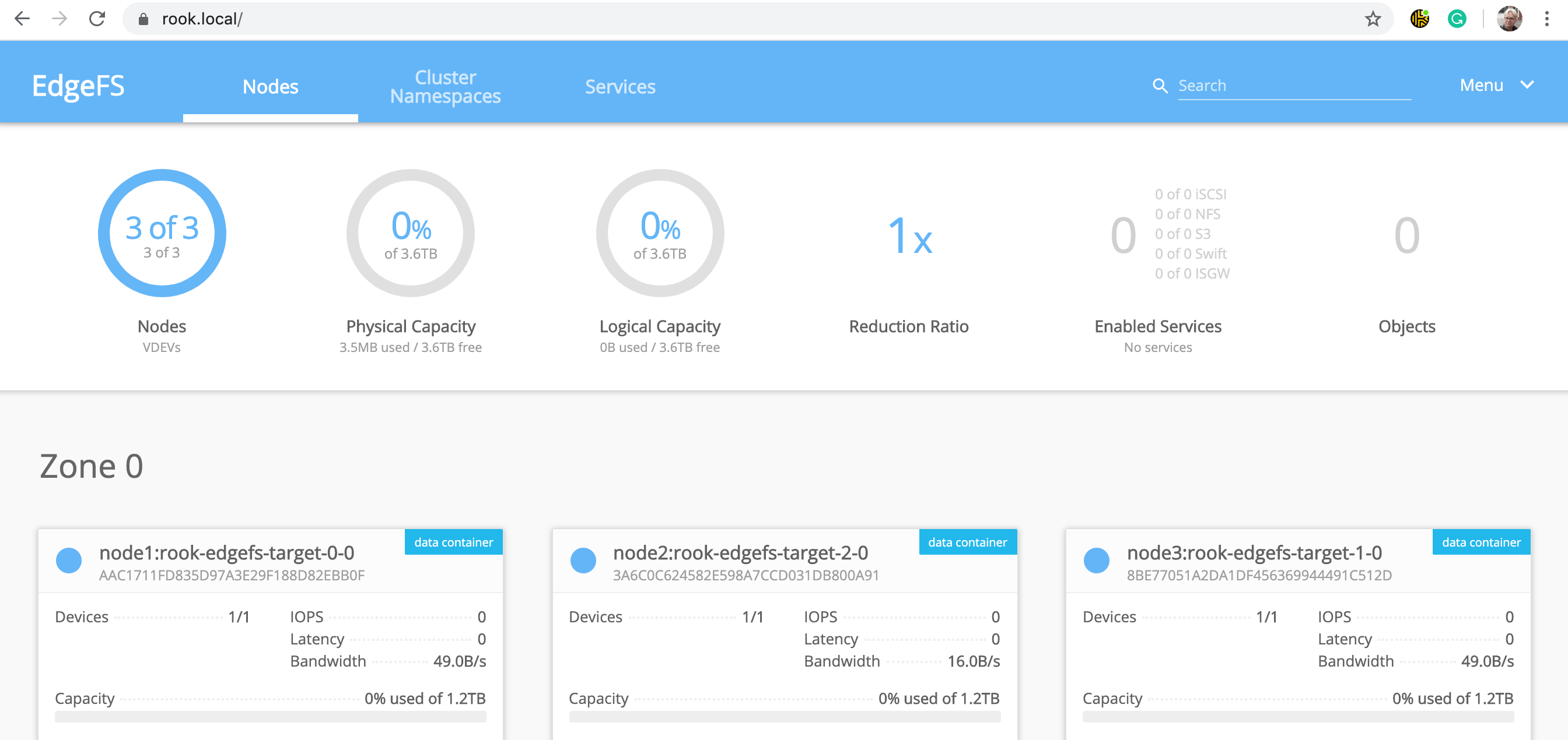 Теперь у вас работает один модуль rook-edgefs-mgr и три модуля rook-edgefs-target. Целевые модули находятся на каждом из ваших узлов. Только что созданные узлы Kubernetes были преобразованы в edgefs узлы 1–3. Обратите внимание, что у вас также есть rook-edgefs-ui. Я собираюсь раскрыть это через вход (определения вы можете найти на вышеупомянутой странице GitHub). Затем, добавив rook.local в мой /etc/hosts файл, я могу перейти на https: //rook.local. Войдите в систему под именем пользователя admin и паролем edgefs и взгляните на свой кластер EdgeFS во всей красе графического интерфейса пользователя!