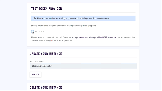 Обратите внимание на конечную точку поставщика тестовых токенов, указатель экземпляров и секретный ключ. Они нам понадобятся на следующем этапе.