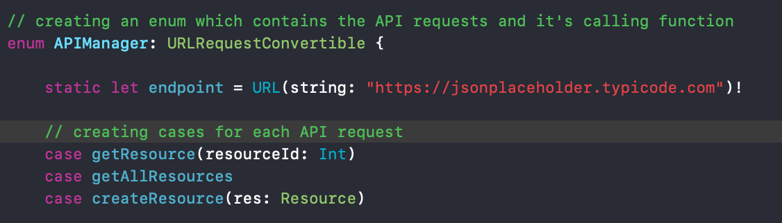 Причина, по которой нам нужно создать этот APIManager как перечисление, состоит в том, чтобы формулировать случаи для различных запросов API.