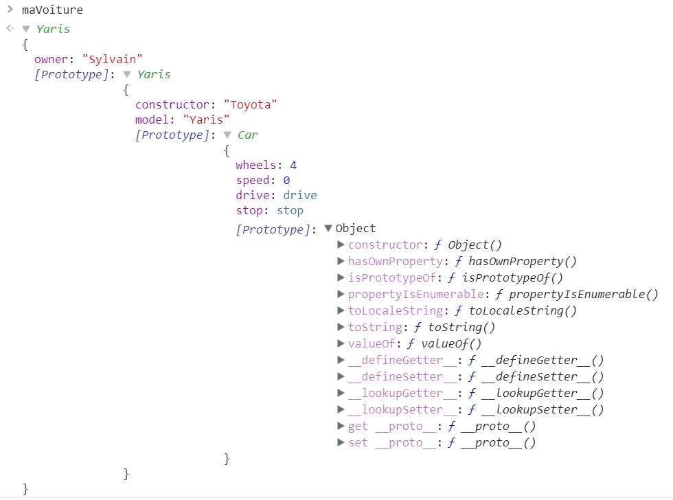 const Berline = Object.create(Car); let peugeot = Object.create(Berline); console.log(peugeot.wheels); // 4