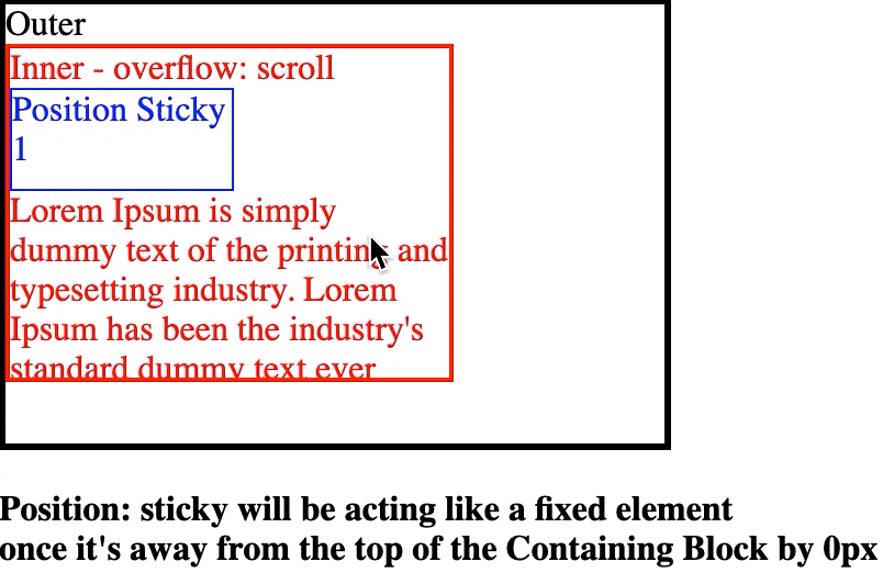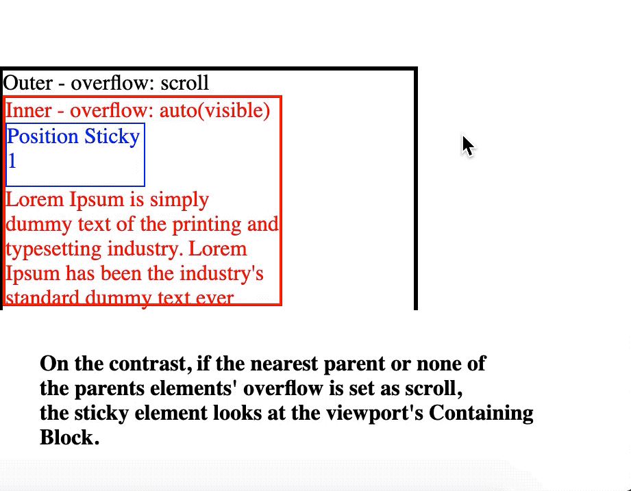 Элемент sticky относится к CB ближайшего родительского элемента, для которого overflow установлено scroll. Если ни один из них не соответствует условию, элемент sticky относится к области просмотра.