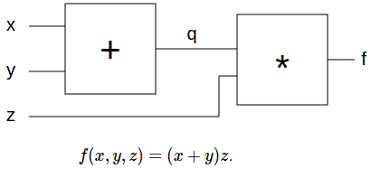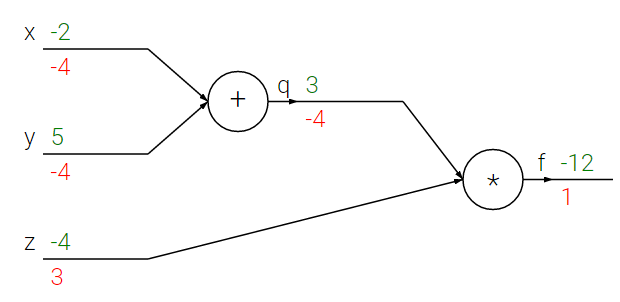 Допустим, у нас есть 3 переменные x = -2, y = 5, z = -4, результат будет f = -12, а наша цель для обучения - -13. Простая потеря = f-цель = 1.