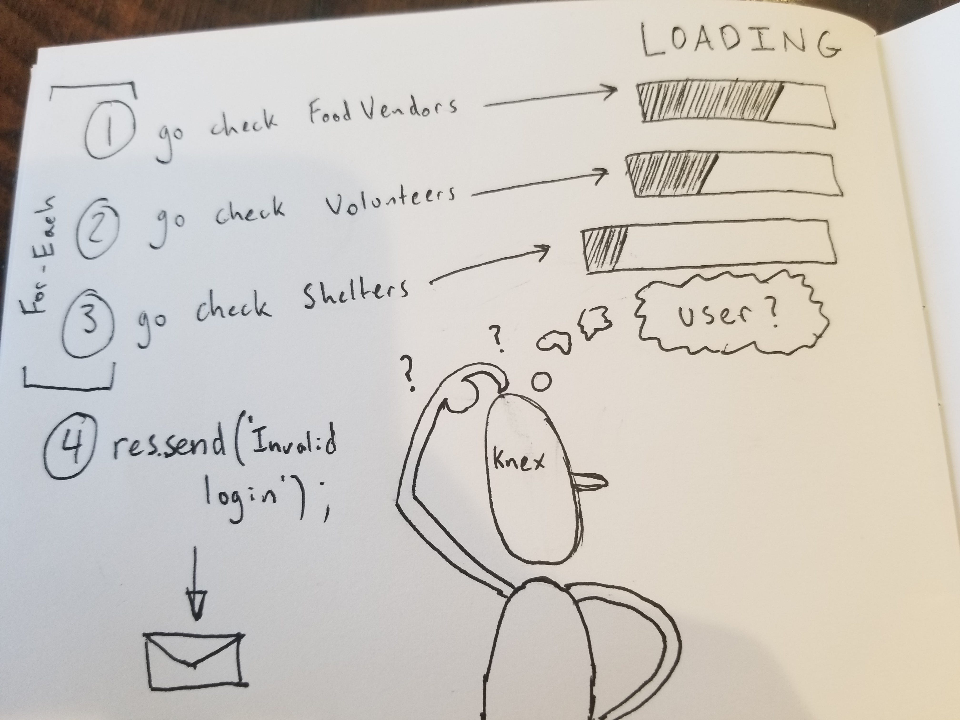 Хотя это значительно уменьшило объем кода, что сделало его легко читаемым, в нем был недостаток. В то время как forEach является синхронным, запросы knex являются асинхронными, поэтому forEach отправляет асинхронный запрос для каждой таблицы. До того, как какой-либо из ответов вернулся, forEach завершается, и сразу же отправляется «неверный логин». Неееет!! Так близко!