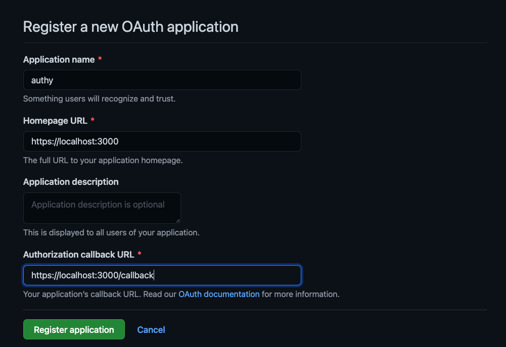 Go to https://github.com/settings/applications/new in your browser and create a new application called authy with a homepage of http://localhost:3000 and a callback url of http://localhost:3000/callback