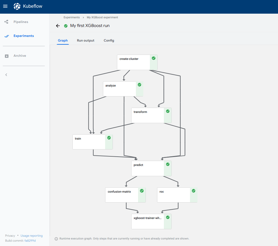 После запуска конвейера конвейеры Kubeflow будут организовывать шаги за вас, и вы можете следить за прогрессом (включая журналы контейнера) в пользовательском интерфейсе.