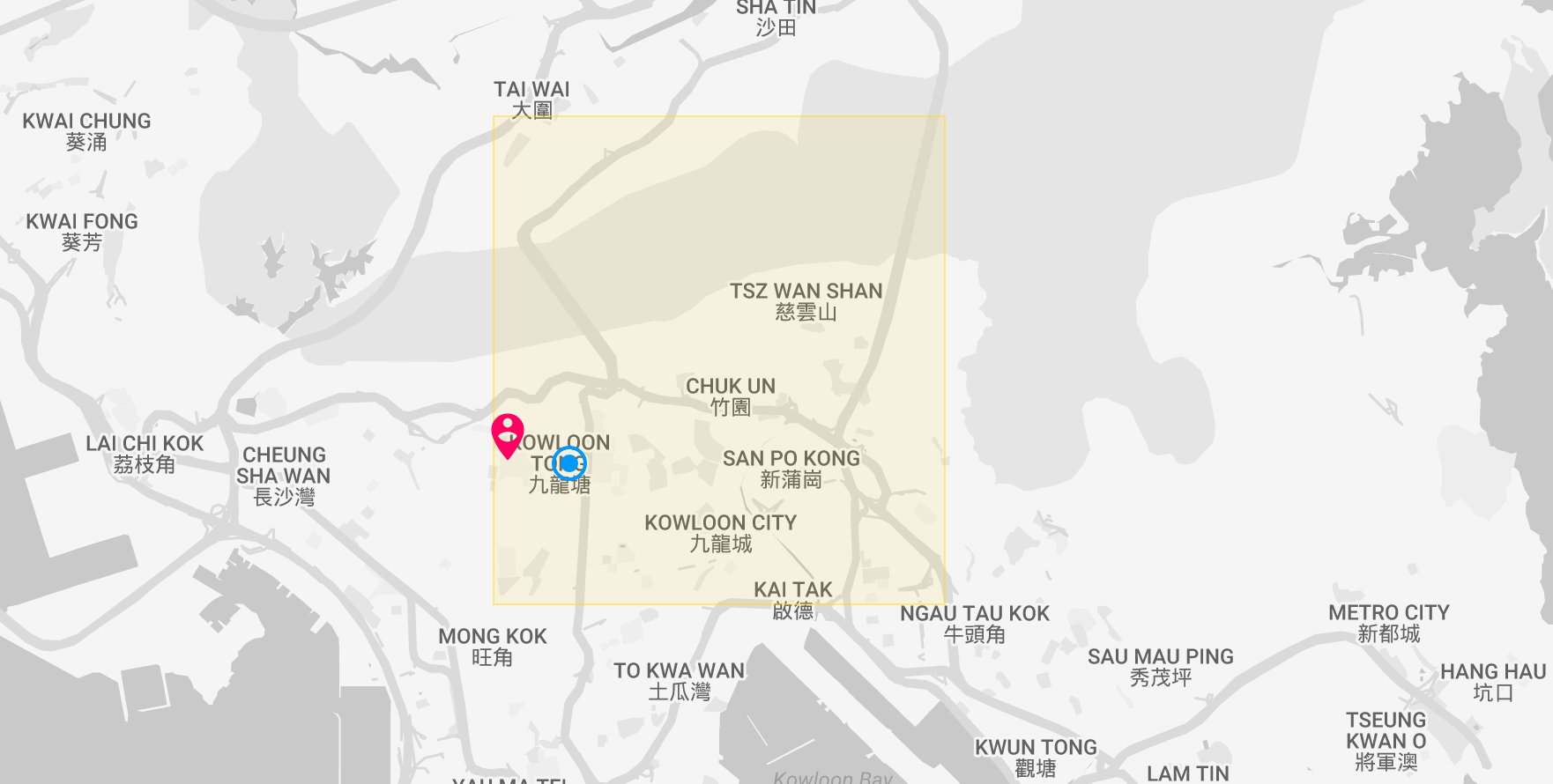 Выше карта - Коулун в Гонконге, желтый квадрат - это покрытие геохеша с точностью - 5 (~ 5 км). Синий значок - это мое текущее местоположение, а красный значок - это люди, находящиеся поблизости в той же комнате. Таким образом, все люди внутри желтого квадрата могут разговаривать друг с другом.