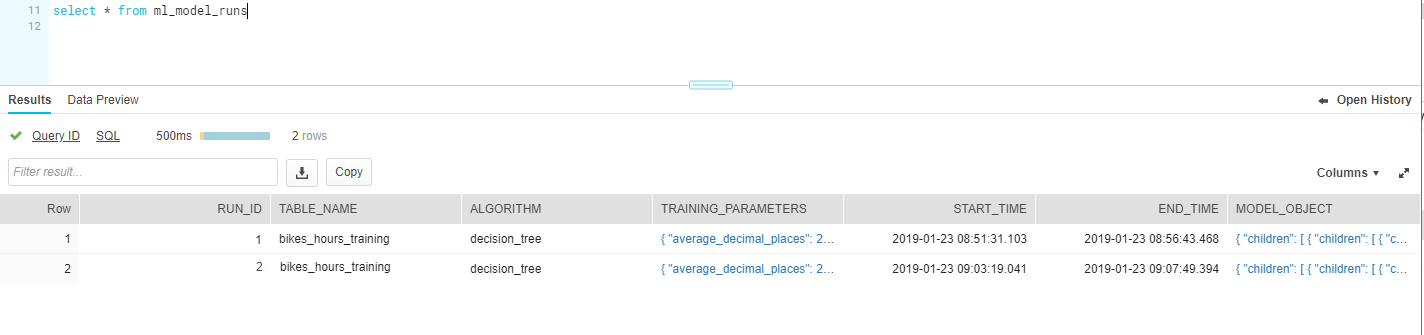 Вот как выглядят полученные модели в таблице ml_model_runs: