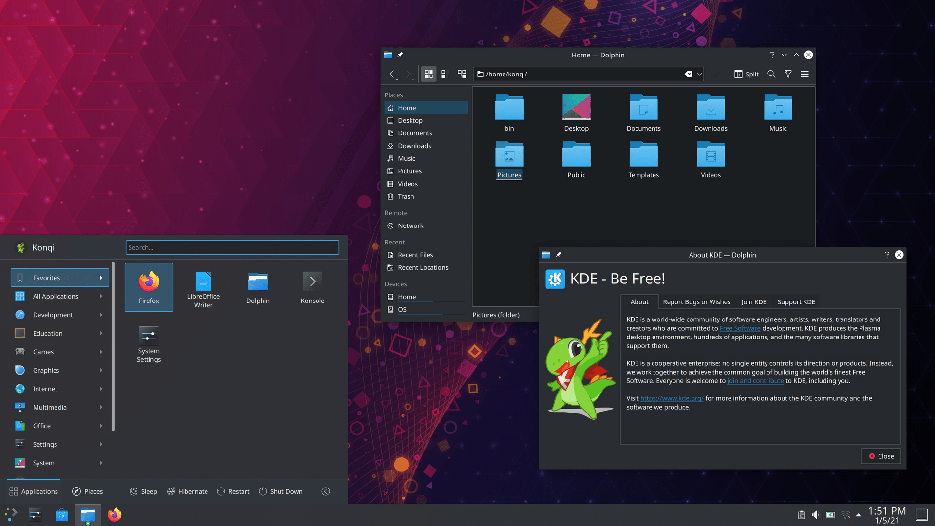 - KDE Plasma (5.20.5) -> Выглядит как Windows, но, на мой взгляд, гораздо удобнее.