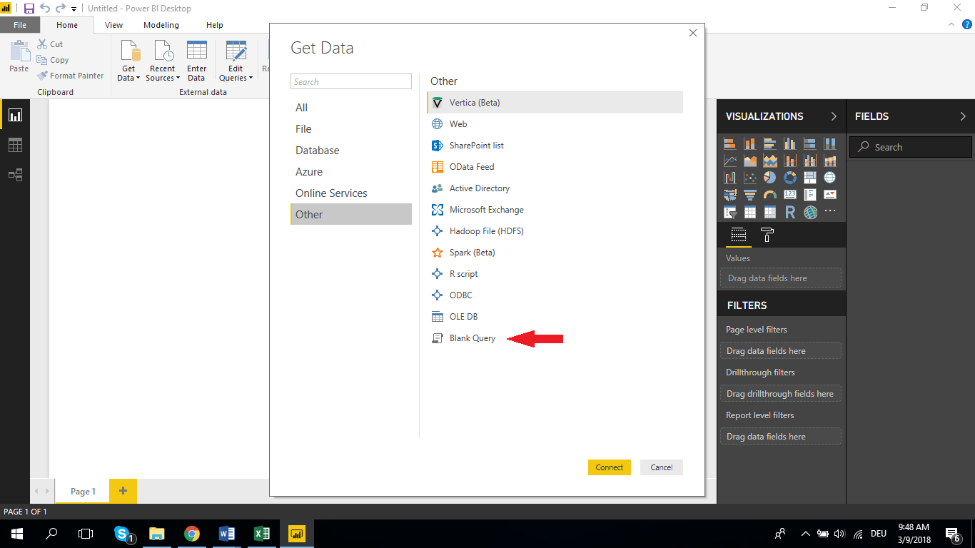 Очень кратко для пользователей Power BI: дважды щелкните значок на рабочем столе. По умолчанию вы увидите домашнюю ленту. Перейдите к значку «Получить данные», выберите «Получить данные» > «Другое» > «Пустой запрос» и нажмите «Подключиться». Кнопка команды «Получить данные» состоит из двух частей: верхней и нижней. В зависимости от того, какую часть вы щелкнете, вам будет представлен немного другой путь к пустому запросу.