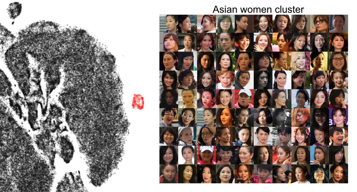 Создаваемые естественные кластеры включают такие вещи, как: пол (мужчина / женщина), раса (азиаты / черные / белые), шляпы, бороды и возраст. Для этого конкретного случая использования возможность обучать модель пола и расы на исходном наборе данных очень полезна, поскольку во многих случаях внешние обучающие наборы отклоняются от набора данных пользователя.