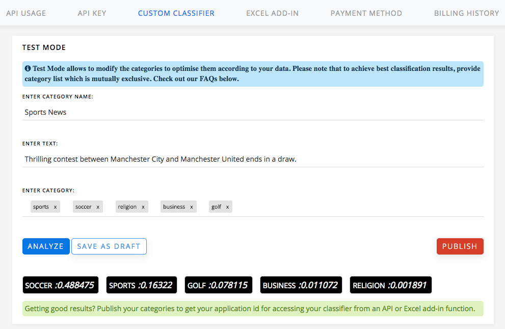 - Перейдите в раздел настраиваемого классификатора на панели управления, предоставьте образец текста и определите несколько категорий для анализа текста. По умолчанию вы находитесь в тестовом режиме, который позволяет вам изменять список категорий сколько угодно раз без каких-либо затрат.