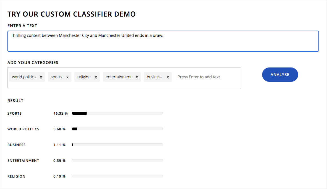 На снимке экрана ниже, сделанном с демонстрационной страницы настраиваемого классификатора на нашем веб-сайте, мы взяли заголовок спорта и определили пять категорий, которые мы хочу разбить этот заголовок на Мировая политика, Спорт, Религия, Развлечения, Бизнес.