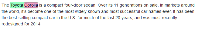 Например: Toyota Corolla, где Toyota - компания, а Toyota Corolla - модель транспортного средства.