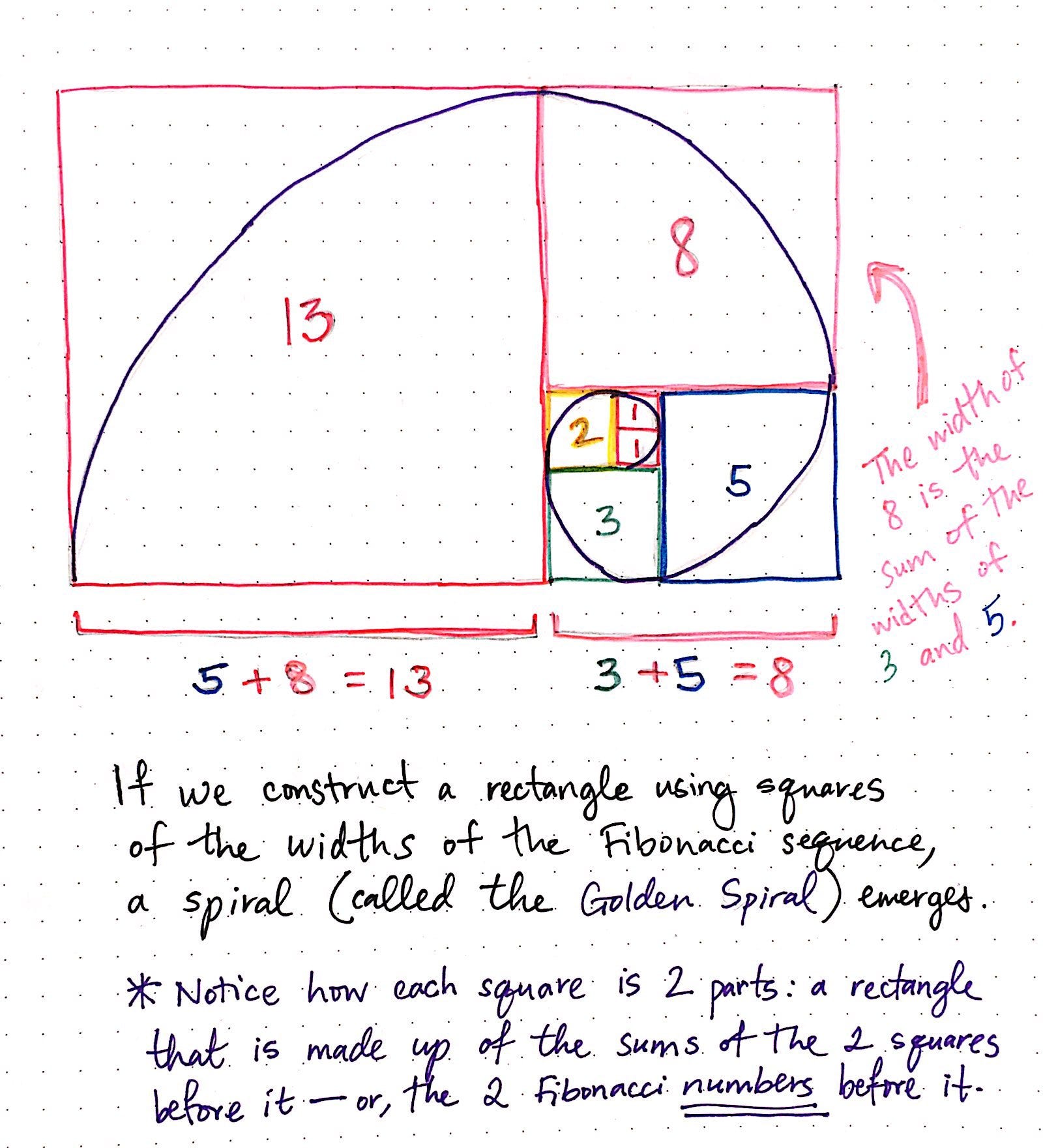 Мы заметим, что ширина каждого квадрата состоит из двух частей: другого квадрата и прямоугольника, ширина каждого из которых является суммой двух квадратов (двух чисел Фибоначчи), предшествующих ему. Например, ширина квадрата 8, нарисованного розовым цветом, является суммой ширины двух квадратов, предшествующих ему: 5 и 3. Точно так же ширина красного квадрата 13 является суммой двух квадратов, которые были до него: 8 и 5.