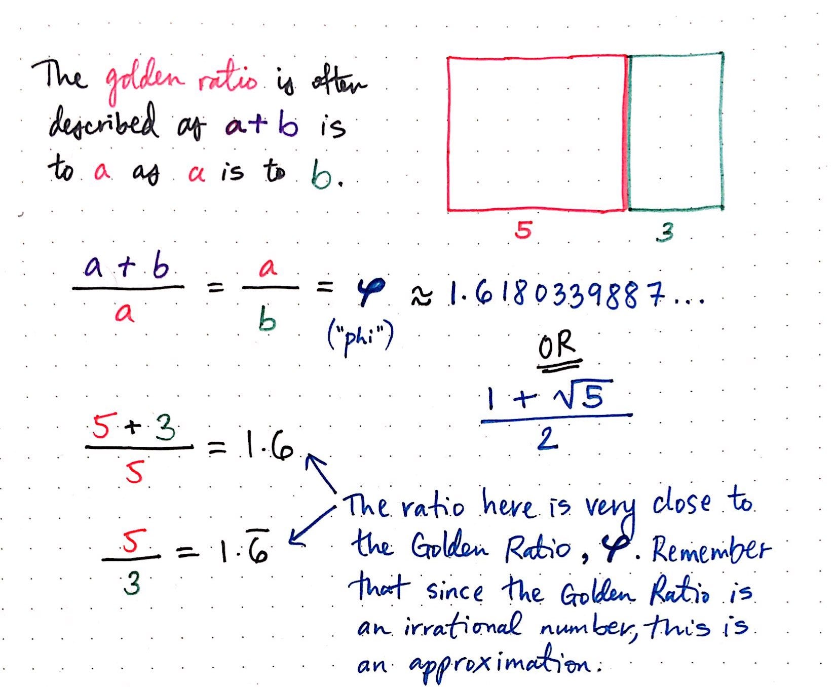 Начиная с 5 + 3 = 8, мы определяем соотношение здесь, разделив 8/3, что составляет 1.6. Если разделить 5/3, мы получим 1,6, повторяя.