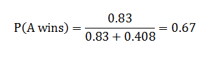Согласно этим весам, оценка для команды A составляет 0,83, а для команды B - 0,408. Для лучшего сравнения мы можем нормализовать оценки, разделив их на сумму оценок. Отсюда получаем вероятности,