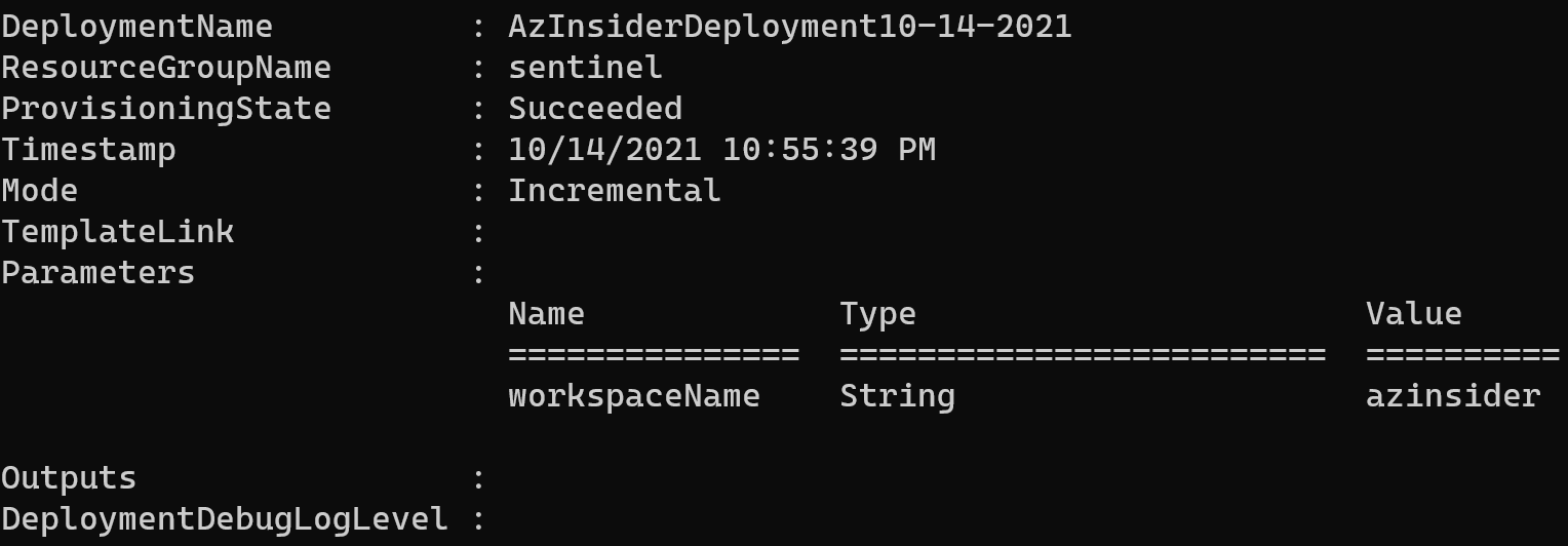 $date = Get-Date -Format "MM-dd-yyyy" $deploymentName = "AzInsiderDeployment"+"$date" New-AzResourceGroupDeployment -Name $deploymentName -ResourceGroupName sentinel -TemplateFile .\sentinel.bicep
