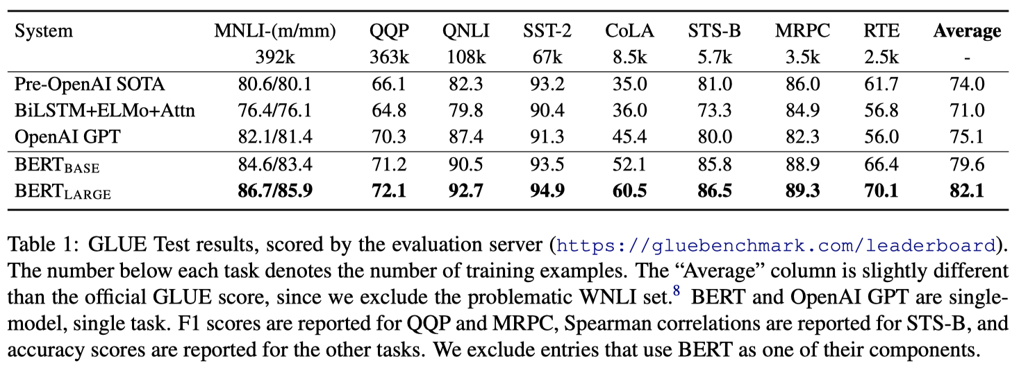 Сравнивая последние две строки, мы видим, что BERT LARGE значительно превосходит BERT BASE во всех задачах.