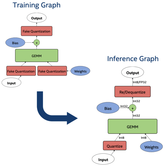 Обратите внимание, что фальшивые операции квантования вставляются в места, где тензоры будут преобразованы в меньшее количество битов во время логического вывода.