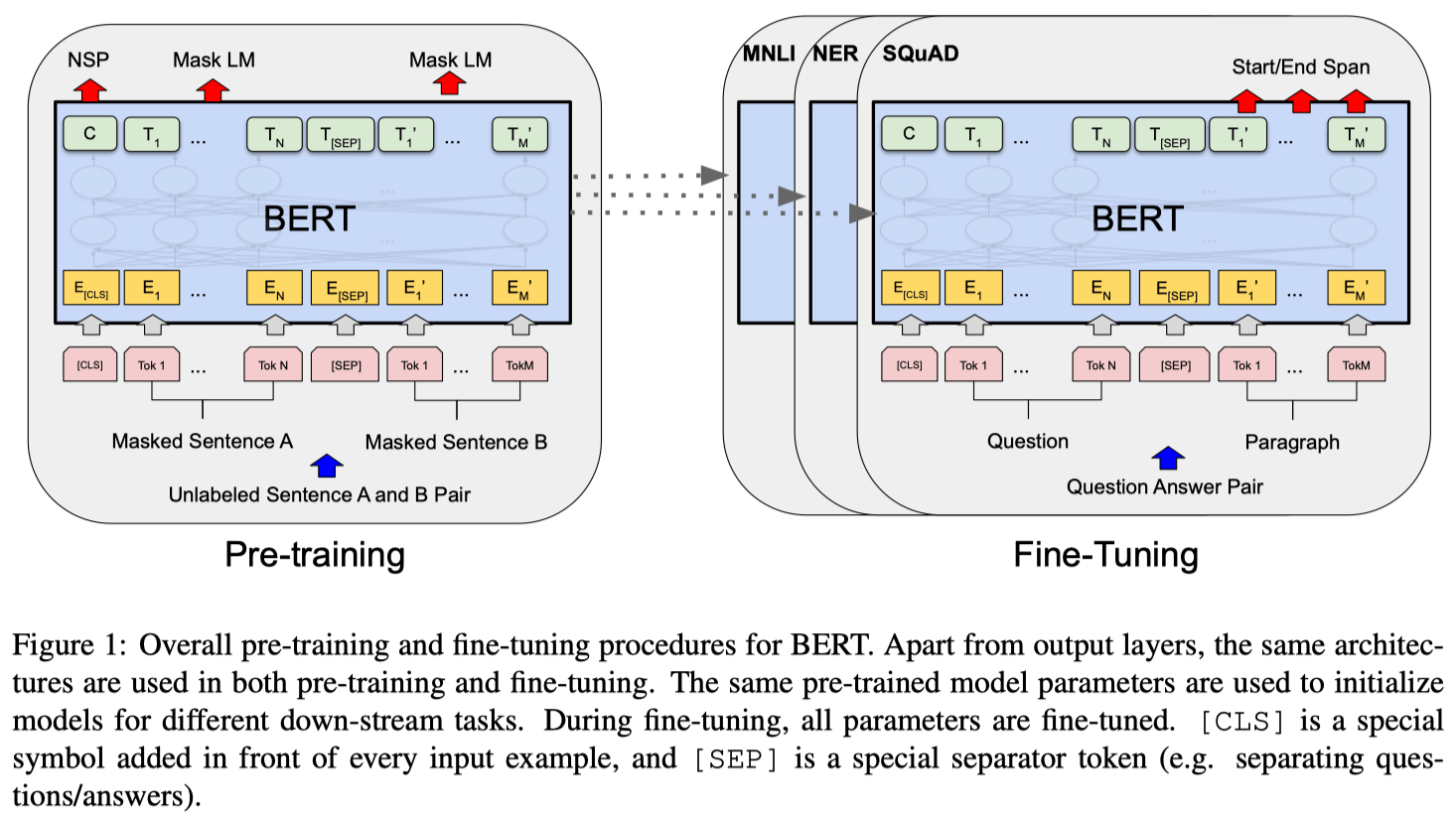 Хорошо, вернемся к предварительной тренировке. BERT обучается на немаркированных данных с помощью различных задач предварительного обучения, таких как языковая модель в маске и прогнозирование следующего предложения.