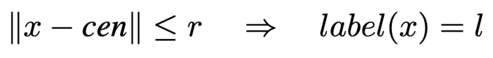 Расширение алгоритма k-средних, используемого для кластеризации обучающих входных данных. Мы используем как сходство точек данных (мера сходства зависит от предметной области, может быть нормой L1 или L2 в зависимости от набора данных), и их метки для выполнения кластеризации. Затем этот алгоритм выводит набор плотных кластеров во входном пространстве, которые находятся близко друг к другу и, как известно, имеют одну и ту же метку. Такие кластеры считаются безопасными регионами, в которых все входные данные должны быть последовательно помечены. Основная гипотеза состоит в том, что для данного кластера C с центром тяжести cen и радиусом r любой вход x в пределах расстояние r от cen должно иметь ту же истинную метку l, что и у кластера.