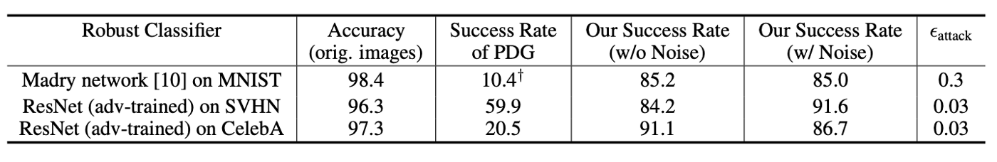 В приведенной выше таблице показан уровень успеха неограниченной состязательной атаки на два сертифицированных классификатора на основе защиты с использованием 10 различных наборов данных. Предполагается, что первый и второй классификаторы способны обеспечить вероятность успеха любой ограниченной атаки с ε = 0,1 всегда ниже 35% и 5,8%. Однако неограниченная атака смогла достичь 86,6% и 88,8% соответственно.