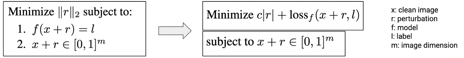 Такой образ называется состязательным примером. В случае с изображением выше оно генерируется с использованием алгоритма Бройдена-Флетчера-Голдфарба-Шанно с ограниченной памятью или алгоритма L-BFGS, который аппроксимирует задачу оптимизации с ограничениями на блоки ниже: