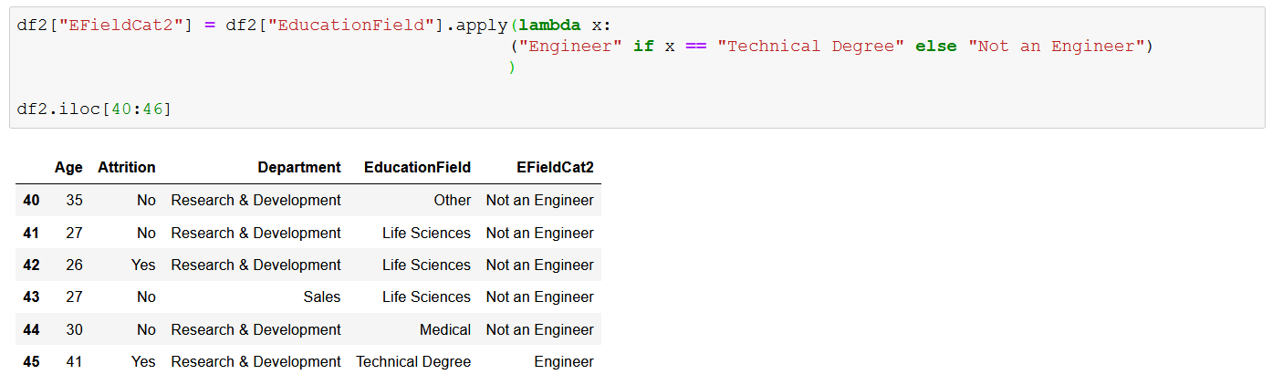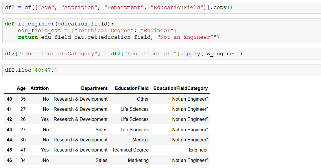 Я определил функцию is_engineer так, чтобы она возвращала «Инженер», когда входными данными является «Техническая степень», в любом другом случае возвращала «Не инженер» — словарь позволяет вам легко расширять классификацию в будущем, если хотите, и Dictionary.get() позволяет указать возвращаемое значение по умолчанию из словаря, если ключ отсутствует в коллекции. Обратите внимание, что вы не можете поставить () после имени функции, которое вы указали в качестве параметра для применения — вы не вызываете функцию при выполнении этой строки, это делает применение, поэтому достаточно указать только имя.