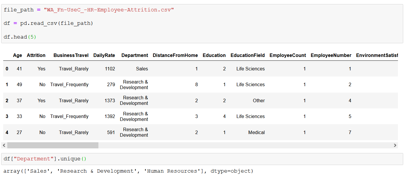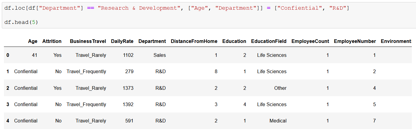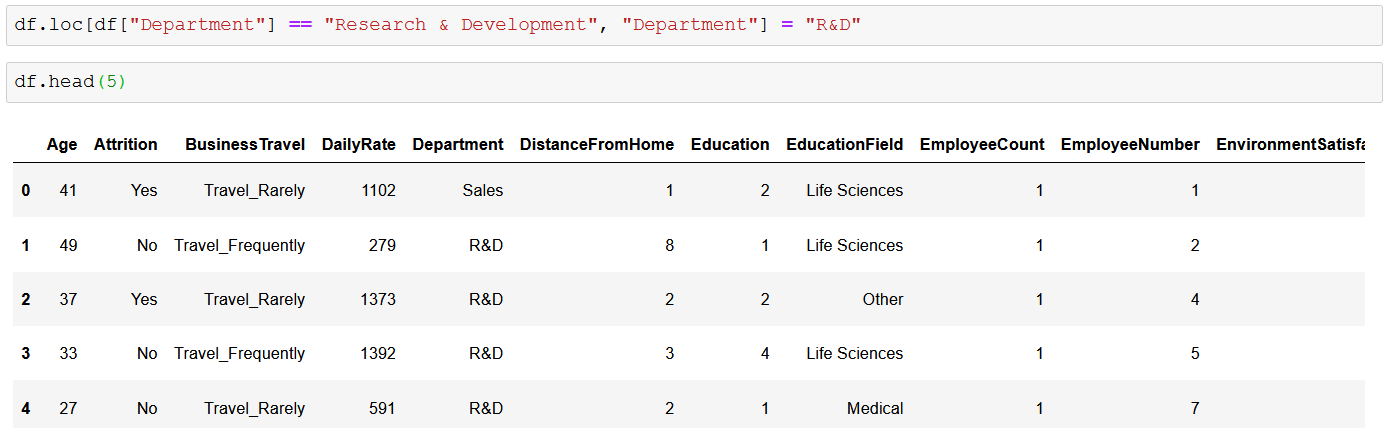 Здесь у нас есть исходные данные об истощении IBM с перечислением уникальных названий отделов. Наша первая задача — переименовать значения «Исследования и разработки» в «Исследования и разработки», чтобы все было кратко и понятно. Давайте воспользуемся loc, чтобы быстро решить эту проблему.