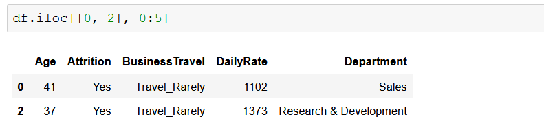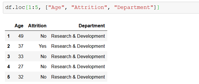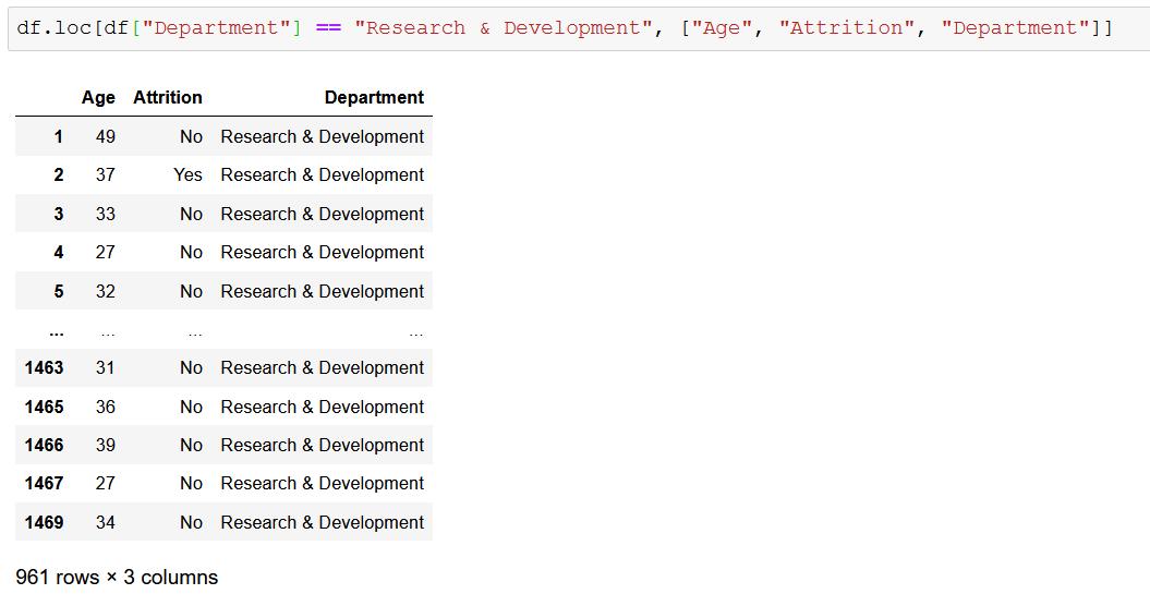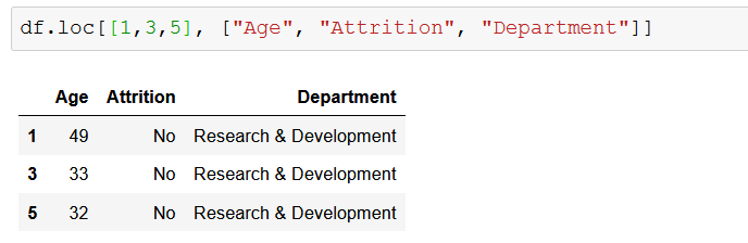 Вы можете использовать метод loc для доступа к определенным строкам и столбцам в DataFrame, используя либо метки, либо логический массив. Простой пример — выбрать вторую строку (метка 1) и столбцы «Возраст», «Увольнение» и «Отдел» с помощью метода loc :