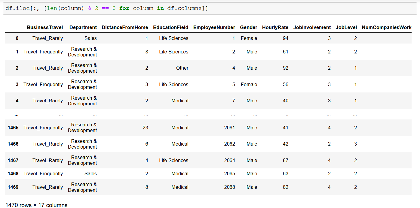 Можно применить и более сложную логику — представьте, что вы хотите вернуть столбцы только в том случае, если длина имени столбца четна. Впрочем, не спрашивайте, почему.