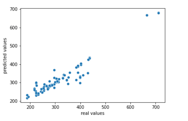 sns.scatterplot(y_test,pred) plt.xlabel(‘real values’) plt.ylabel(‘predicted values’)