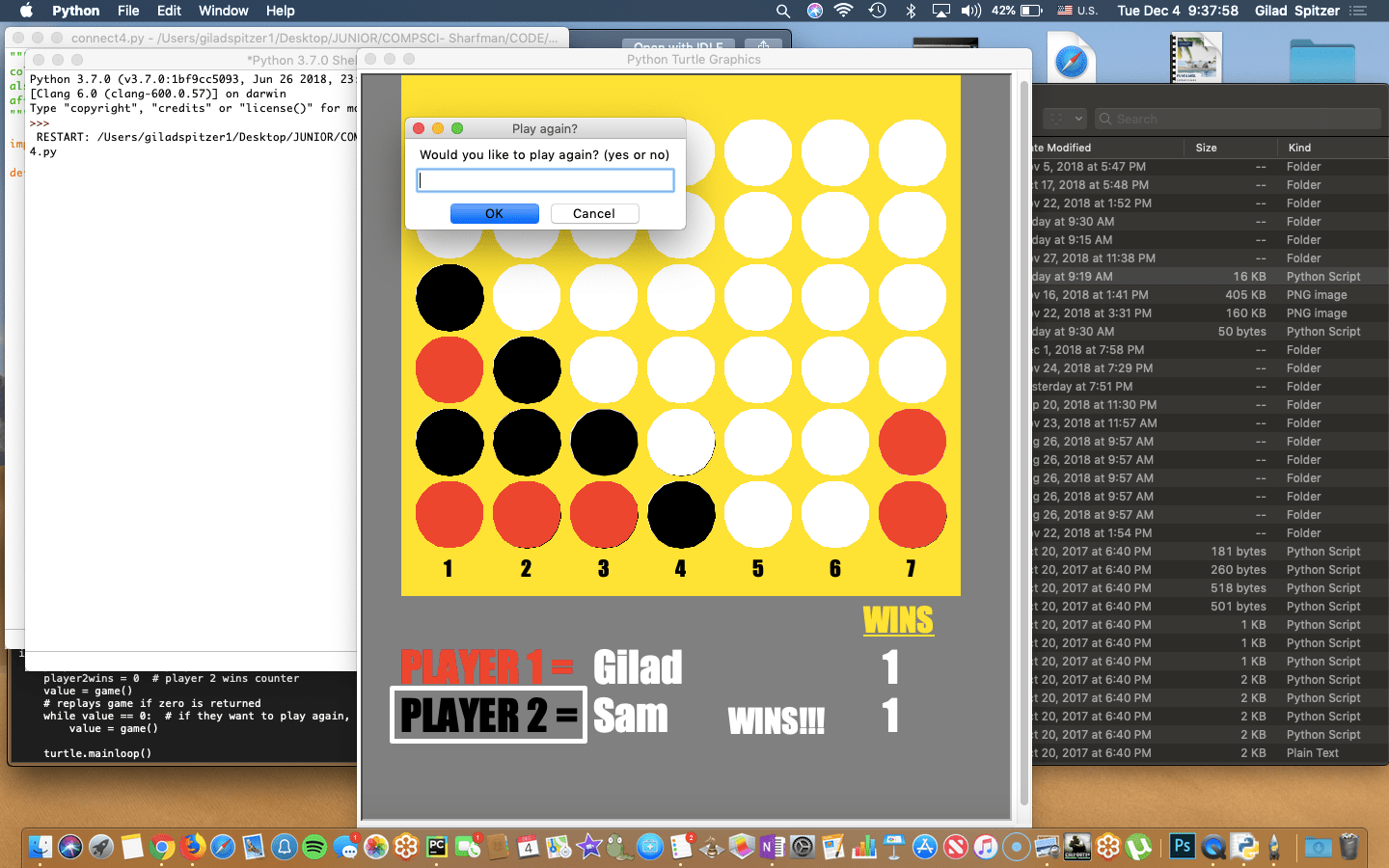 - Каждый студент создал разные настольные игры, используя Pygame, конструктор графического пользовательского интерфейса на основе Python. Я, конечно же, выбрал Connect4, мой фаворит детства.
