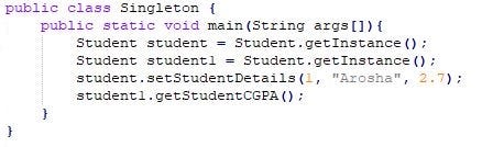 Из приведенного выше сегмента кода мы создаем класс Student и делаем его конструктор закрытым. Затем создайте статический экземпляр (obj) самого себя.