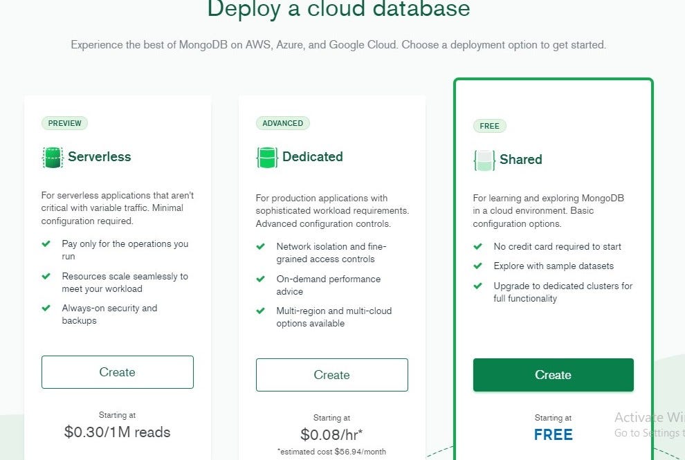 Общий: это похоже на пример развертывания, который используется для изучения MongoDB, нет необходимости вводить кредит или какие-либо данные карты, вы можете напрямую запустить кластер, используя эти параметры, это бесплатный уровень, который предоставляется MongoDB, вам нужно выбрать эту опцию.