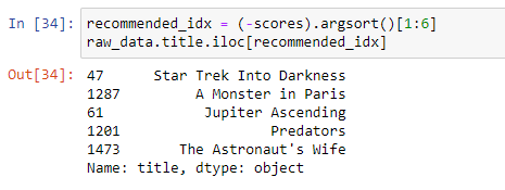 NB: индекс argsort() совпадает с индексом фрейма данных, с которым мы работаем. Таким образом, мы можем получить названия фильмов из фрейма данных, используя индекс, возвращаемый функцией argsort(). Ниже представлены фильмы, наиболее похожие на фильм с индексом «0». Индекс 0 был опущен, потому что это сам фильм.