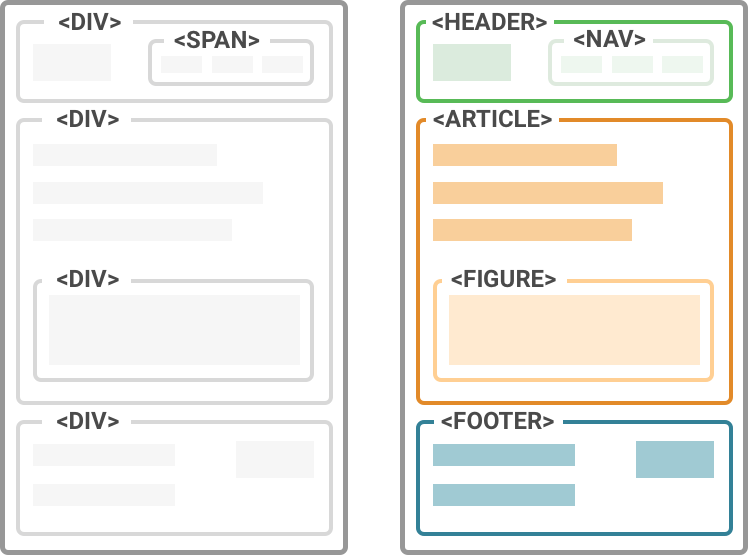 В то время как веб-дизайнеры и разработчики продолжают использовать несемантические теги для разделения содержимого веб-страницы, следующие семантические теги предоставляют веб-браузерам более точную информацию о макете содержимого страницы и ее назначении. Это помогает поисковым системам получать более точные данные о веб-страницах, повышает удобство работы пользователей и повышает доступность веб-сайтов.