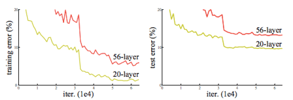 Итак, авторы статьи Resnet задали очень простой вопрос: «Изучить более совершенные сети так же просто, как сложить больше слоев?», поэтому, чтобы определить, можно ли просто добавлять все больше и больше слоев и получать все лучше и лучше модели они сделали эксперимент. Для эксперимента они сделали две разные модели, чтобы попытаться предсказать, всегда ли большее количество слоев делает модель лучше: у одной было 20 слоев, а у другой — 56.