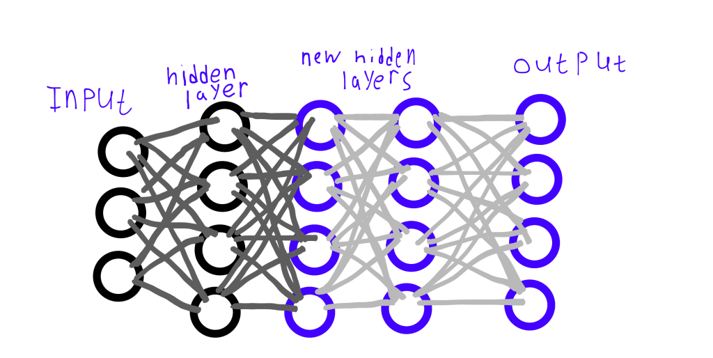 Чтобы глубокая модель работала так же хорошо, как и поверхностная, новые скрытые слои (те, что выделены синим цветом на картинке выше) должны сохранять тот же результат, что и старый скрытый слой (причудливыми словами, новые слои должны найти отображение личности)