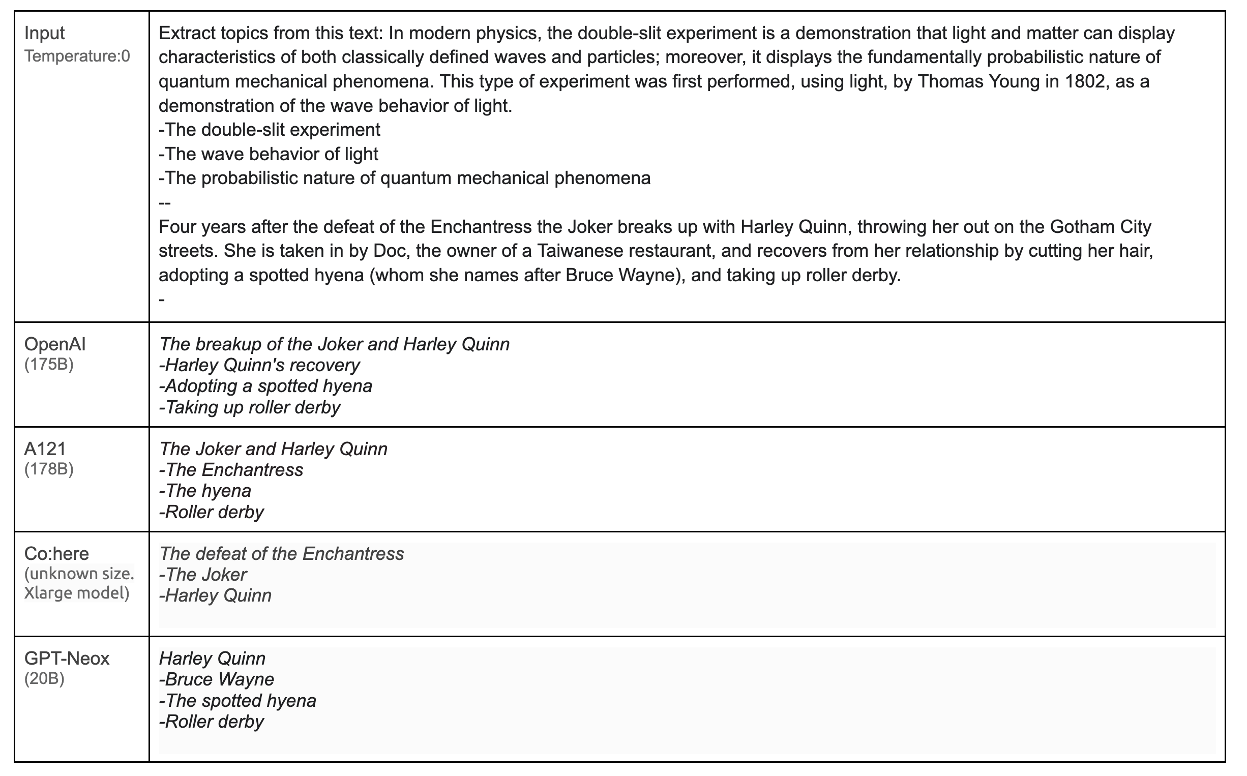 Различные варианты использования, продемонстрированные OpenAI, AI21, Co:here и GooseAI