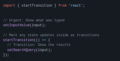API startTransition помогает нам сохранять отзывчивость нашего приложения во время обновлений или рендеринга больших экранов. Этот API позволяет нам контролировать внешний вид параллельных рендеров для улучшения взаимодействия с пользователем.