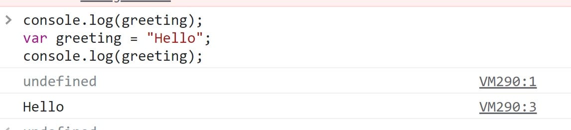 Переменные с «var» обрабатываются перед выполнением любого кода, во время этапа создания контекста выполнения, объявление переменной var в любом месте кода эквивалентно объявлению ее вверху. Первоначально они инициализируются значением undefined и, следовательно, к ним можно получить доступ до оператора объявления.