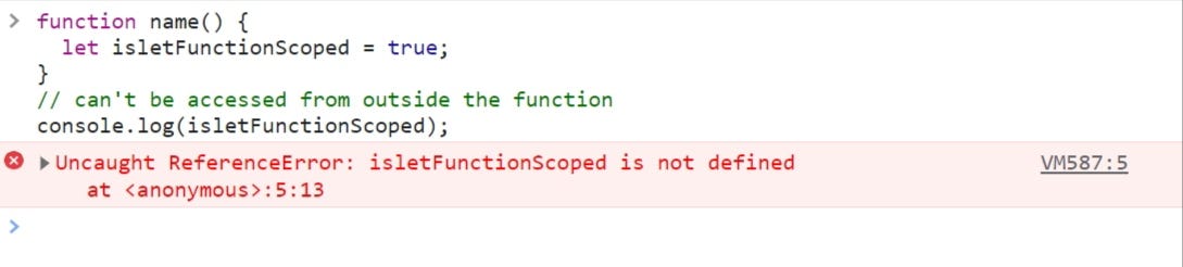 С другой стороны, как видите, с помощью let и const я не могу получить доступ к переменным, объявленным в блоке, из внешнего блока и функций.