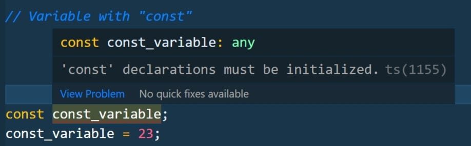 DECLARATION с разными ключевыми словами отличается или, скажем так, объявленная переменная действует по-разному, переменные с «var» и «let» могут быть объявлены без инициализации, тогда как с «const» это не так. .