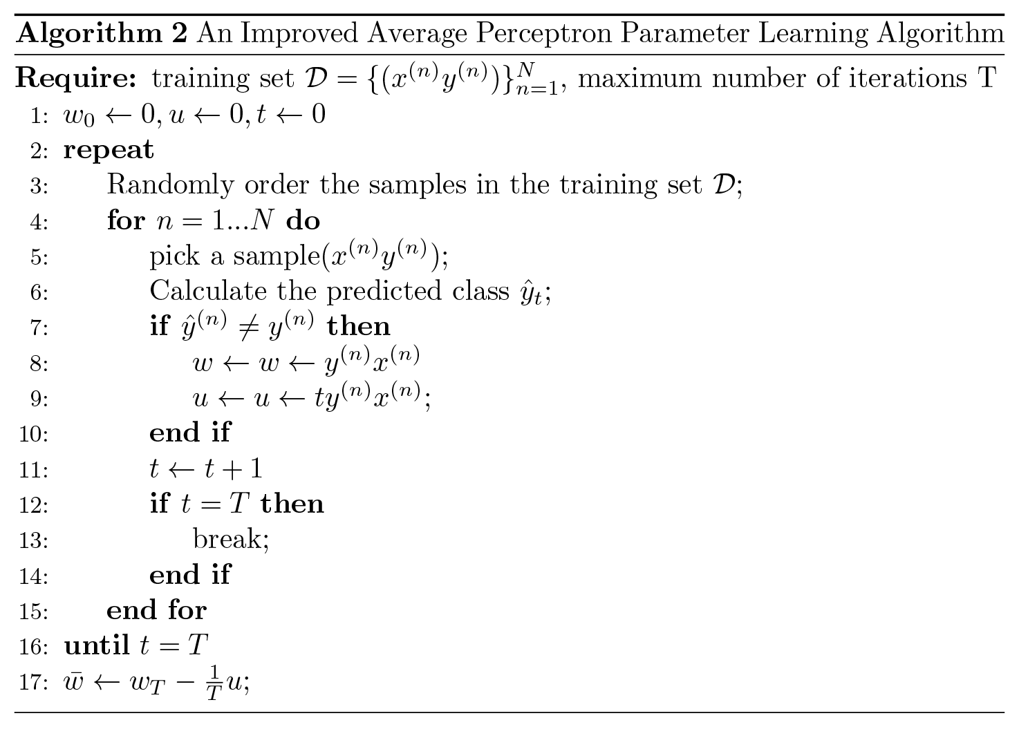 Персептрон — простейшая нейронная сеть, и алгоритм ее обучения также очень интуитивен и эффективен [Rosenblatt, 1958]. [Freund et al., 1999] предложил использовать ядерные методы для улучшения алгоритма обучения персептрона, а также использовать голосующие персептроны для улучшения способности к обобщению. [Collins, 2002] расширил алгоритм персептрона до структурированного обучения, дал соответствующее доказательство сходимости и предложил более эффективную и практичную стратегию усреднения параметров.